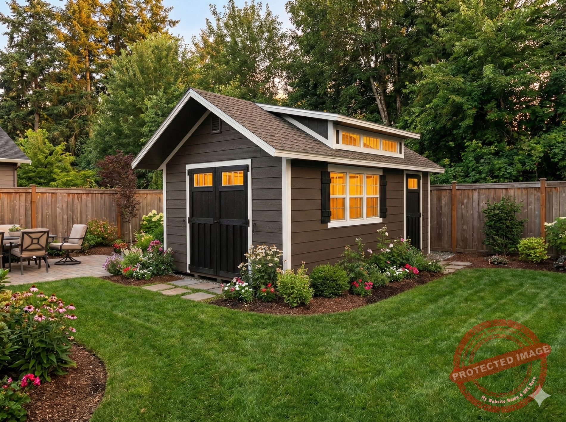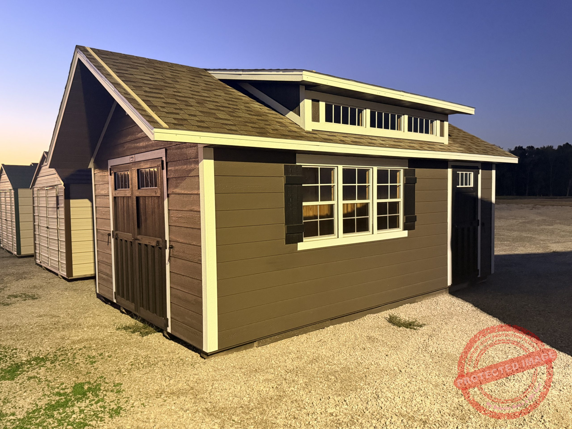 Smoke House Grey Lap Siding gives this building some real charm! Dormer sets it apart from the neighbors shed for sure!