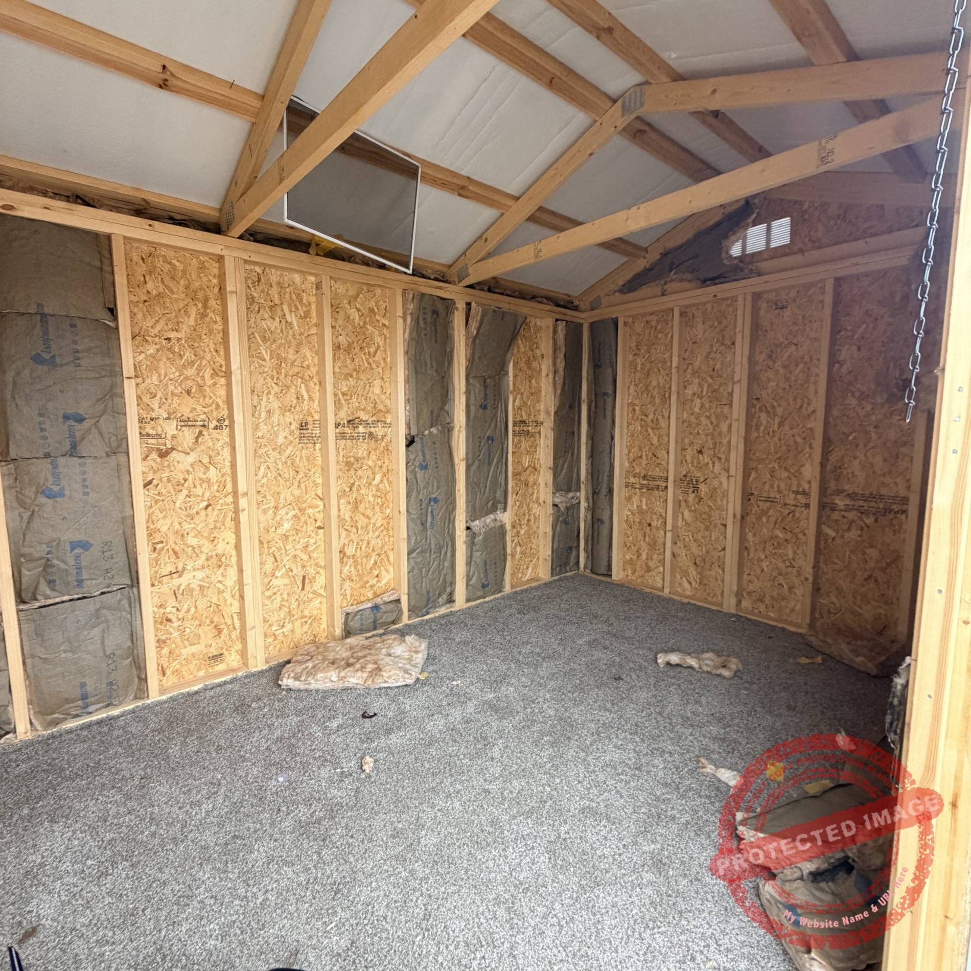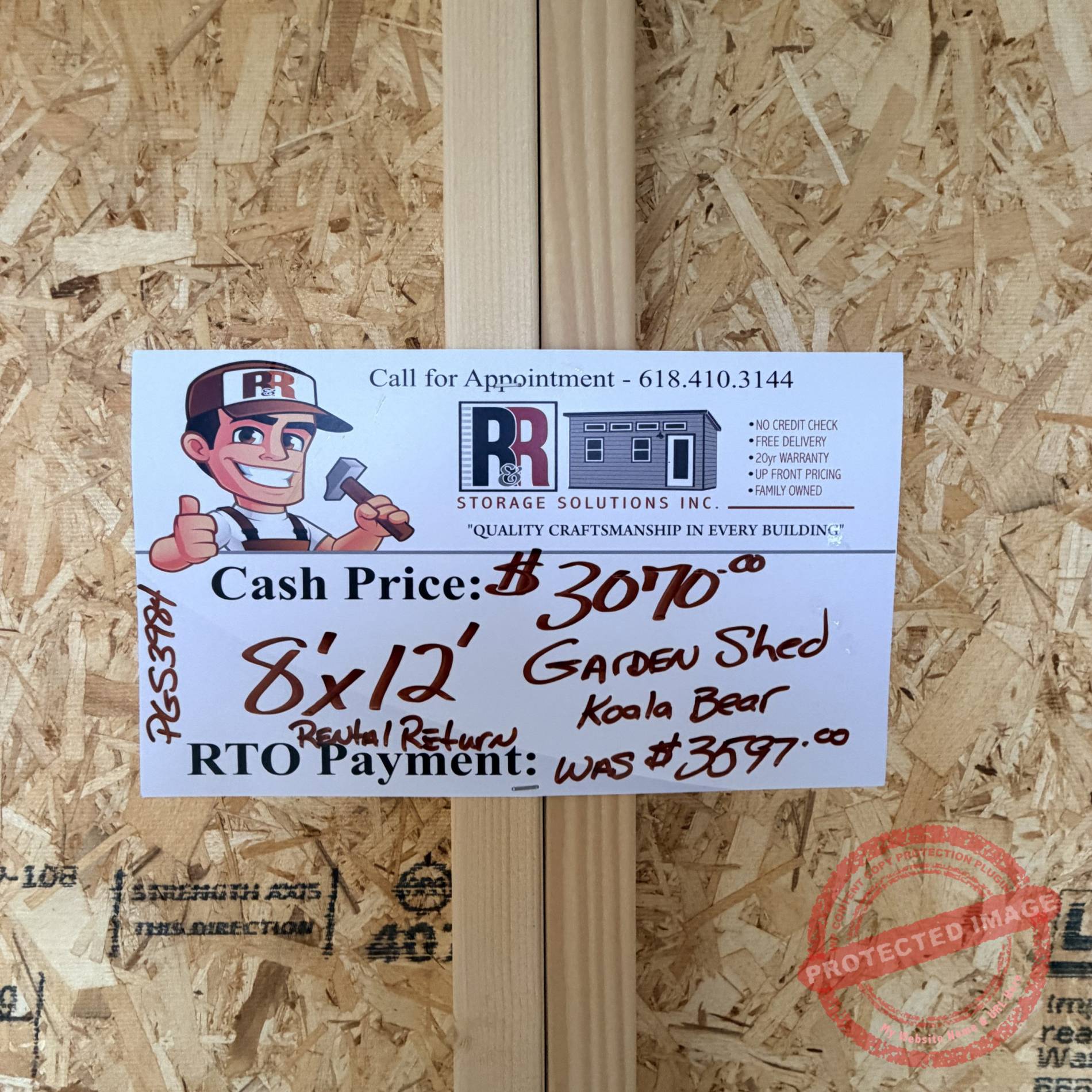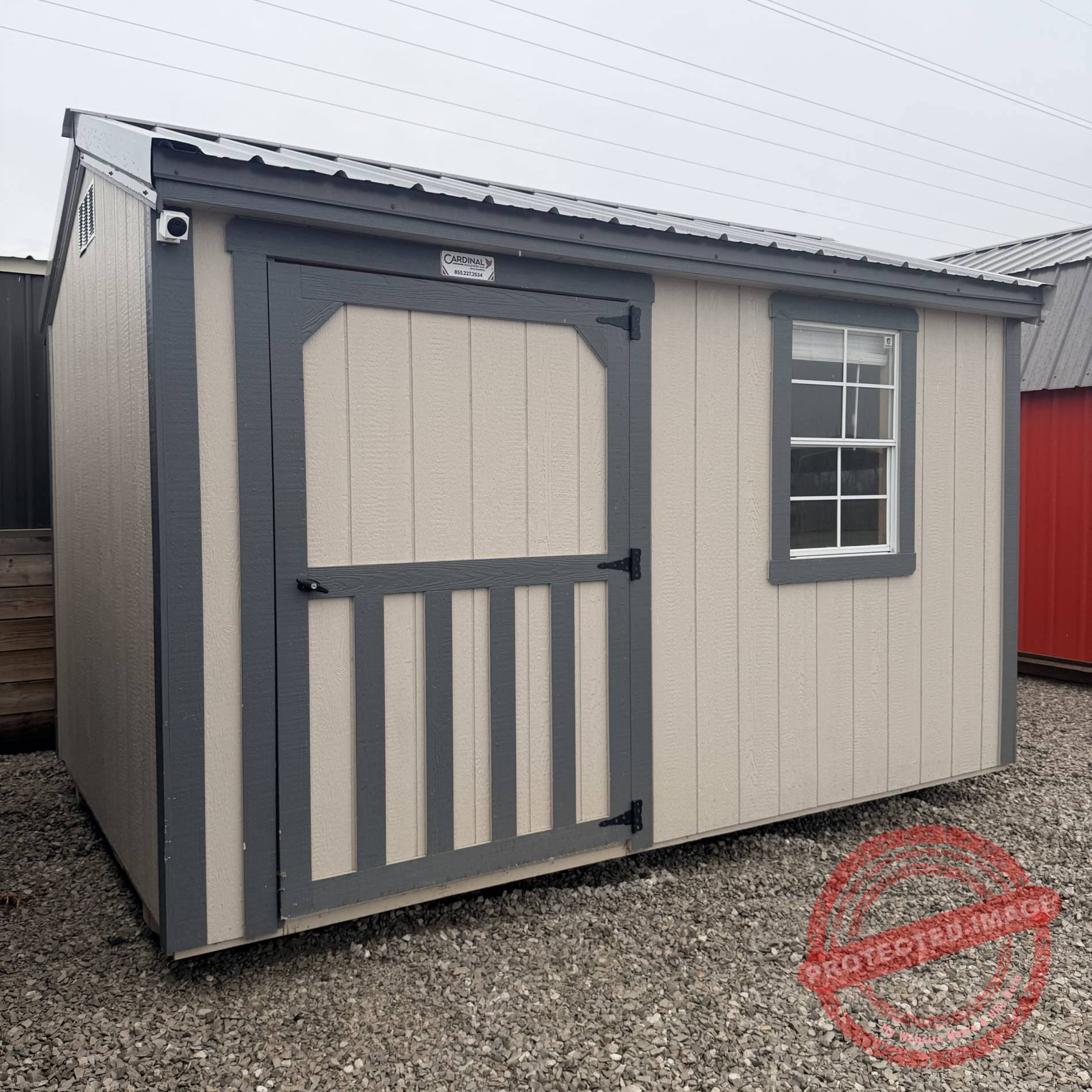 In stock 8 x 12 garden shed manufactured by Cardinal Portable Buildings LLC.